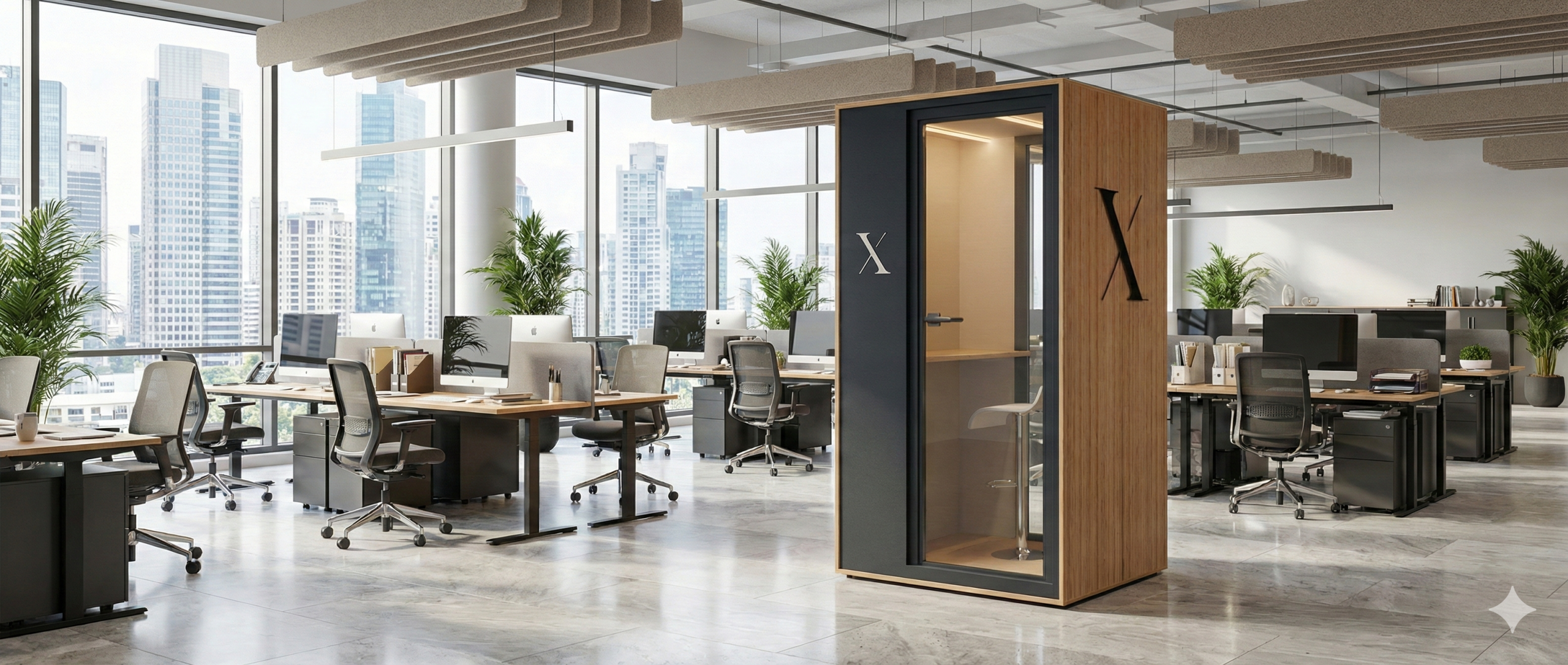 Grazie a pannelli fonoassorbenti, legno naturale, ventilazione silenziosa e opzioni smart, puoi trasformare ogni spazio in un ambiente ideale per la concentrazione e il benessere.