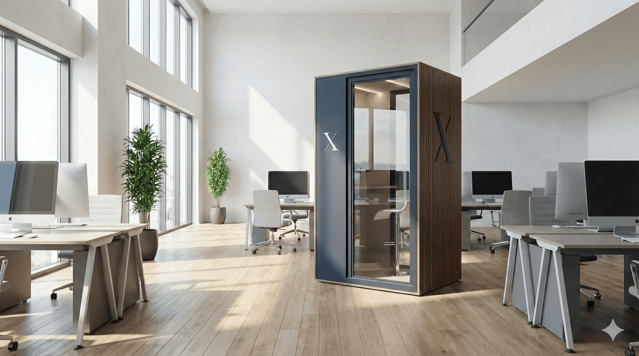 Con una struttura portante in abete e pannelli fonoassorbenti a vista, unisce estetica e funzionalità in poco più di un metro quadro. Il rivestimento interno in legno naturale e la porta in vetro stratificato acustico garantiscono un isolamento efficace, mentre luce LED, ventilazione meccanica e tavolo integrato completano l’esperienza di comfort.